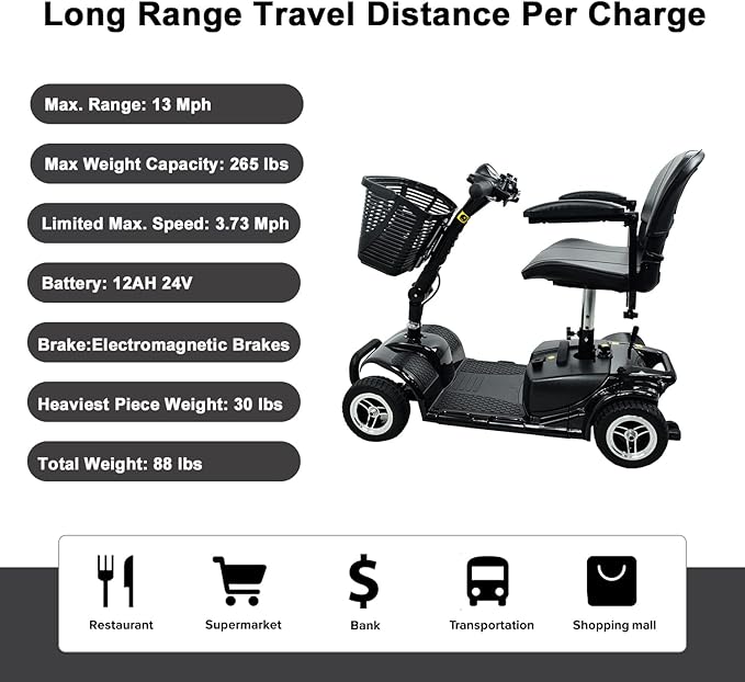 Elifecenter 4 Wheel Electric Battery Powered Mobility Scooters for Adults by Emotor, Portable Folding in 5 Pieces Compact Mobile Stable Scooter for Seniors (Black)